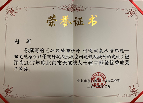 副院长付军教授的“加强城市修补创造优良人居环境——回龙观居住区景观绿化及公共空间建设及提升的建议”,被评为2017年度北京市无党派人士建言献策优秀成果三等奖。据悉,在此次评选中,全市共有33篇优秀成果获得嘉奖,其中特等奖3篇,一等奖5篇,二等奖10篇,三等奖15篇。