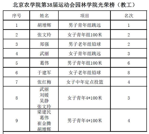 获得女子团体总分第4名、男子团体总分第5名、团体总分第5名的喜人成绩,以及“最佳精神风貌”荣誉称号。闭幕式后,学院领导来到运动员、参演者及志愿者们身边,肯定和感谢大家的努力,并与运动会服务人员、参与表演的园林学子及园林运动健儿们在操场合影留念,定格园林精彩拼搏、斩获佳绩的一天。