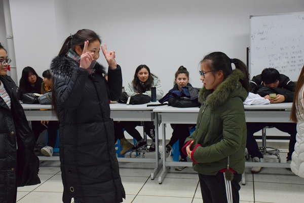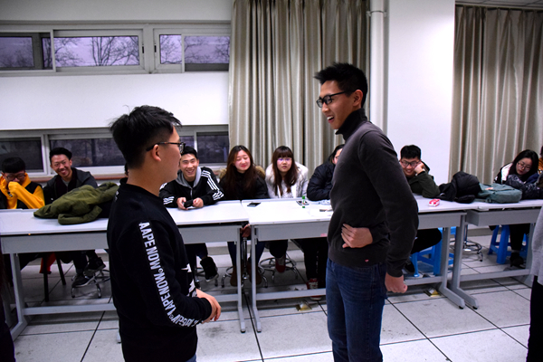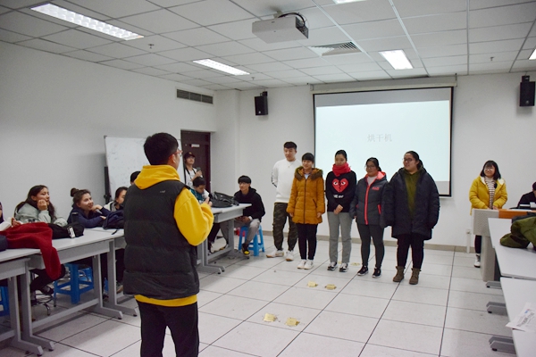 你比画我猜游戏则更加注重比划词语的人与猜词语的人之间的默契程度与大脑灵活度。游戏一开始的猜词速度并不快。两人之间配合也不默契,但随着一次次的互动积累经验,当游戏进行到最后一组时,有一组同学在限定时间内答完了所有题目,让在场同学感受到了他们之间的心有灵犀。