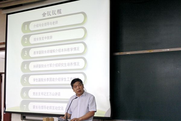 在教学楼B座303召开了“家校合作,助力成长”2017级新生家长会,会上,党总支书记王万山,院长张克中,党总支副书记、学生工作副院长李国政,科研副院长付军,教学副院长胡增辉分别代表学院和各自分管工作向家长进行宣讲和介绍。会议由党总支副书记、副院长李国政主持。会后,家长和学院领导进行了简短的沟通,就不了解的问题向学院各领导进行咨询。