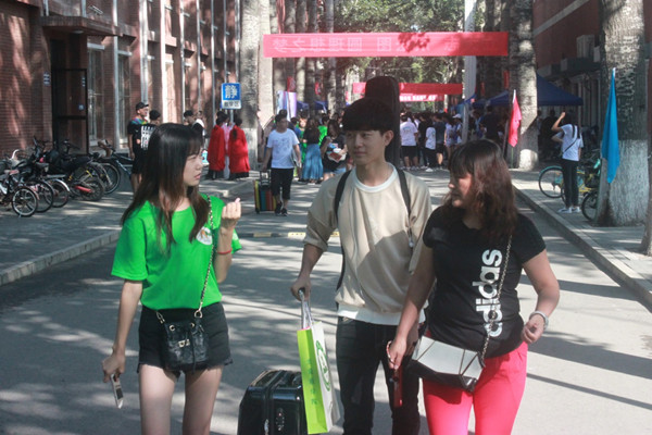 上午的新生报到十分热闹,这是新生们进入大学生活的第一天,不少新生家长一早就与新生一同前往报到处。由于新生对于学校环境不熟悉,学生会的工作人员和班助与学生和家长进行讲解,积极带路,主动提供帮助。