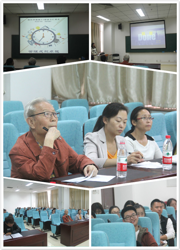 诵一本著作,得一位良师。本次汇报会以“管理成就卓越”为主题,大家围绕所读的管理类书籍开展汇报交流。风景园林专业的陈小云同学为大家介绍了世界著名管理大师戴维·艾伦的《搞定》。她从自己接触这本书的一点经历,一点感想谈起。在压力重重,信息量和工作量倍增的当今世界,《搞定》一书从自我认知到时间规划再到心态的调整,为我们做了详细的阐述,指导我们要做到从容、放松,方能走出规划和执行工作中的泥沼,通向高效、轻松的彼岸。