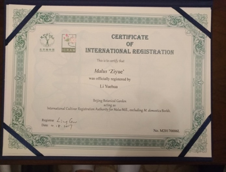 紫月海棠Malus‘Ziyue'(国家林业局植物新品种,品种权号20150050)在2017年4月18日全国观赏海棠学术研讨会上获得了观赏海棠国际登录证书。这是中国区观赏海棠首次国际登陆,此次登录共有6个新品种,紫月海棠的登录号为M20170006L。