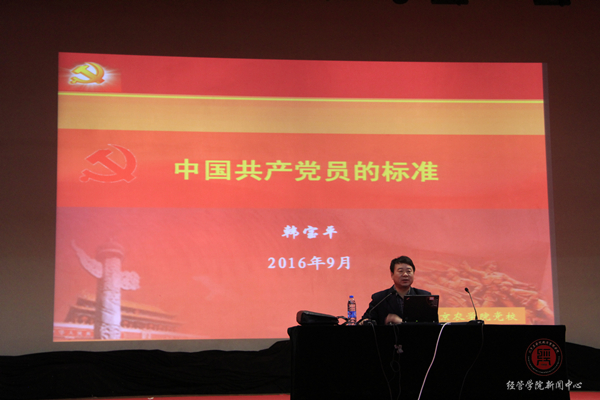 上午8:30,校学生工作部部长韩宝平老师以“共产党员的标准”为题,给全体学院作报告。韩老师向同学们讲了两部分:一是要同学们明确标准,确立奋斗方向,主要包括基本标准、历史标准、具体标准。同时又针对具体标准中的培养标准和考核标准对同学们做了重点说明;二是争先创优,争取早日入党。韩老师尤其给同学们强调了如下四点:一要学习理论,坚定信念 ;二要牢记宗旨,勇挑重担; 三要艰苦朴素,勤奋好学;四要严以律己,争做模范。韩宝平老师精细深入的讲解以及联系实际的举例使同学们进一步了解党的标准,入党流程以及自己今后奋斗的方向。