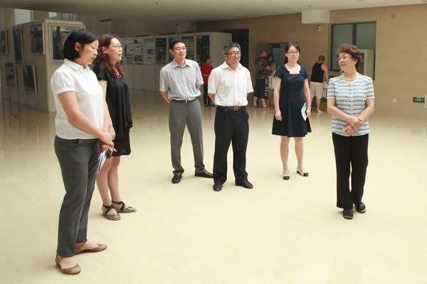 党总支书记王万山,院长马晓燕,副院长王文和、李金苹,辅导员老师王雪与王天晨作品展的指导老师贾海洋齐聚园林楼一层与画展王天晨一起探讨艺术的魅力。
