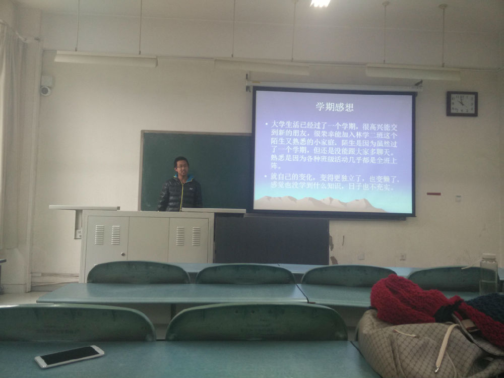 14级林学二班在教B113教室召开了期末述学班会。班会上,每位同学以PPT的形式总结了自己从开学到期末4个多月间的经历与收获。