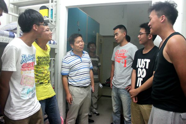 在9号男生宿舍楼,老师们一起去了E129、E223等宿舍,叮嘱同学们保管好个人财务,提高警惕,注意用电安全等事宜。轻松愉快的谈话之后,王老师与新生合影留念。