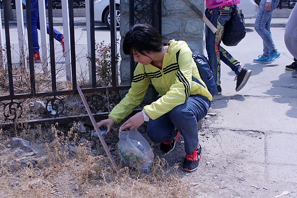 在各小组组长的带领下,同学们携带着自备的塑料袋和其他清理工具,头顶炎炎烈日,来到活动区域。大家分工协作,认真清理道路两侧和小花园中的垃圾。谈及体会,13级杨佳楠同学说:“为学校做些力所能及的事是我的荣幸,算不上‘要求’。”