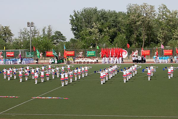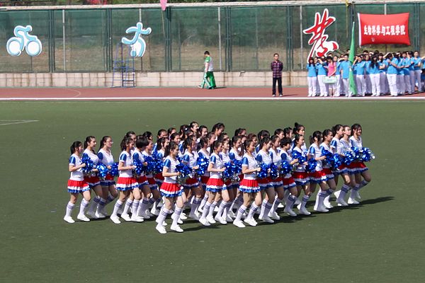 带来的精彩的啦啦操表演。45名青春靓丽的女生手拿亮蓝、银白色的花球,步伐一致地跑向了操场的中央,组成了三角形的队形。富有节奏感的音乐响起,啦啦操的队员们身随乐动、朝气蓬勃,不断有序地变换成为心形、V形、圆形等等队形。他们在操场上奔跑着,舞动着,尽情地展示着青春的活力,让大家感受到了园林的热情。经过了近一个月的准备,每一位同学都很认真准确的将每一个动作做到位。随着背景音乐的停止,啦啦操演出圆满结束,赢得了现场观众热烈的掌声。随后,战友俱乐部、计算机学院也进行了精彩的表演。