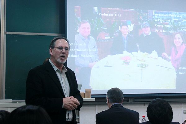 会上,Richard 首先就本学校的基本概况进行了简单的介绍。康涅狄格大学是一所1881年建校的公立大学,拥有100多个专业的学士学位,教学和科研方面都享有国际声誉,也被誉为“美国最值得一上的大学”之一。同时也表示很期待与中国高校建立互联互惠的关系,之后详细介绍了园林和风景园林等专业本科生留学美国的“3+1”和“3+2”项目,涉及留学的学费,专业的分类,学位的介绍和师资的配备等方面。Pete和Kristin也先后就自身的学习履历,教学方向目标,项目研究成果等进行了简单的说明。