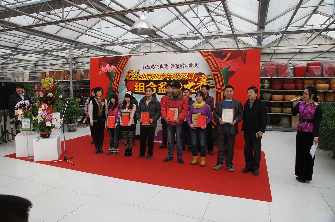 2013年1月19日,由北京市园林绿化局、北京花卉协会、北京迎春年宵花展组委会主办的2013北京迎春年宵花展开幕仪式暨组合盆栽大赛颁奖仪式在丰台花乡世纪奥桥花卉园艺超市举行。来自北京各大花卉市场和花卉企业的负责人、各区县花卉主管部门负责人,获奖作者、媒体记者和花卉爱好者近200人参加了本次活动。开幕式上有600余件精美的组合盆栽作品被展出,其中50多件作品获奖。