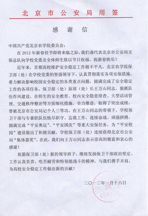 北京市公安局给学校发来感谢信