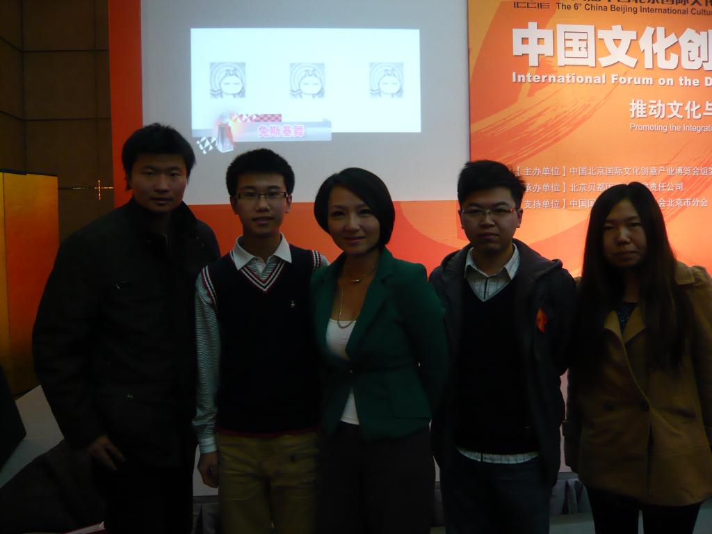 团队成员参加第六届文化创意产业博览会 国际论坛 与大会主持人(名人堂主持人)路彬彬合影