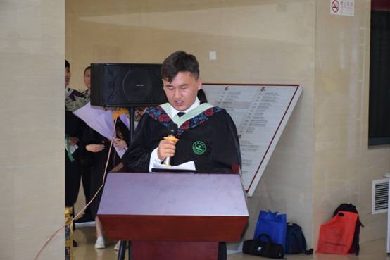 2019届风景园林学研究生毕业生代表蒋彤彤发言,她回首了在北农的美好时光,感谢了老师们的辛苦付出。她倡议毕业生要遵守校纪,文明离校。她表示要心怀母校,实践梦想,不辜负母校的栽培和期望,勿忘初心,永远牢记自己是个北农人!