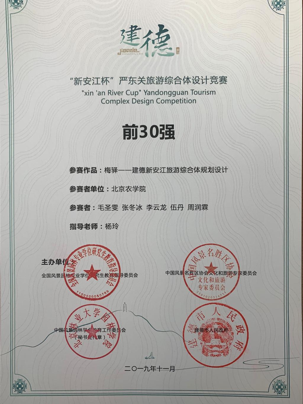 即刻组织参赛工作。最终,由杨玲老师指导、由毛圣雯、张冬冰、李云龙、武丹、周润霖五位风景园林研究生完成的“梅驿——建德新安江旅游综合体规划设计”作品经过多轮角逐,在强手如林的参赛对手中,以总排名第26的好成绩进入前30强,为我校争得了荣誉。