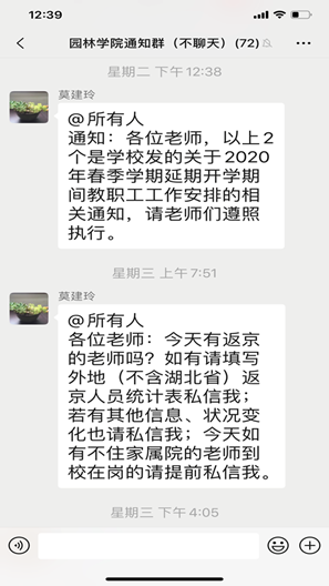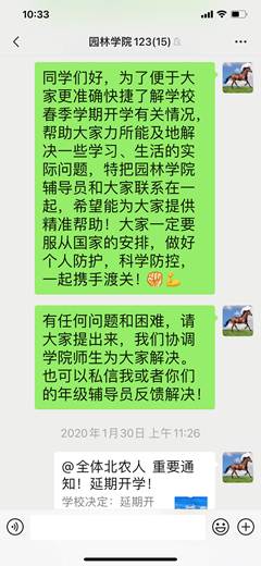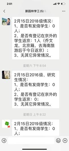 学生寒假去向统计表》发挥了重要作用,疫情爆发时,学院第一时间就筛选出了身处湖北的10名同学,及早建立了单独的微信联络群,定期了解他们近况、有效开展线上心理辅导、叮嘱安全防范。此外,还帮助2名因疫情导致家庭困难的湖北籍同学申请了临时困难补助,及时送去温暖和关怀。学院还通过微信、电话等方式第一时间传达延期开学、线上教学等通知。每天及时收集掌握师生离京、返京等情况,提醒每位返京师生严格执行居家隔离要求。
