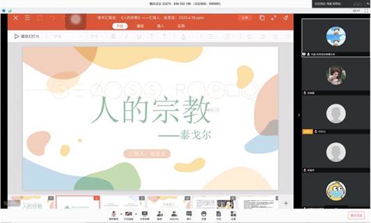 第一位汇报的同学是19级风景园林的张思佳,她带来的图书是拉宾德拉纳特· 泰戈尔的著作《人的宗教》,本书是一部人生思想、人生价值的经典之作。泰戈尔从哲学意义上深刻思考人的信仰、世界的本质、生命的价值,对人类生存的现实世界进行了深切的人文关照,表现了他独特而精妙的人生哲学思想。全书从人与宇宙的关系开始阐述,包括了对宇宙、自然、人文、心灵、感官、天性、艺术、教育、自由等方面的思考。如张思佳同学所介绍的,全书主张最高真理只存在内在的灵性世界,便是贬损外在的物质世界;若说最高真理只存在外面,那也不是真理。真理存乎合一。如泰戈尔所言“宗教是普世人性当中的个体解放,但两者在人性面并无二致。”张思佳同学还同大家分享了泰戈尔的其他文学作品的名言名句如《飞鸟集》、《吉檀迦利》、《世界上最远的距离》。