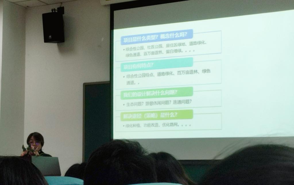 接着,高帆院长以“浅谈如何完成项目的设计工作”为题对即将踏入社会工作的风景园林学生详细介绍了如何才能良好的完成项目的设计工作。高工通过以小微绿地、矿山生态修复、绿色通道、景观生态林造林为例,向我们指出在接到项目时,首先要明确4个问题:1.项目是什么类型及概念?2.项目有何特点?3.我们的设计解决什么问题?4.解决途径是什么?