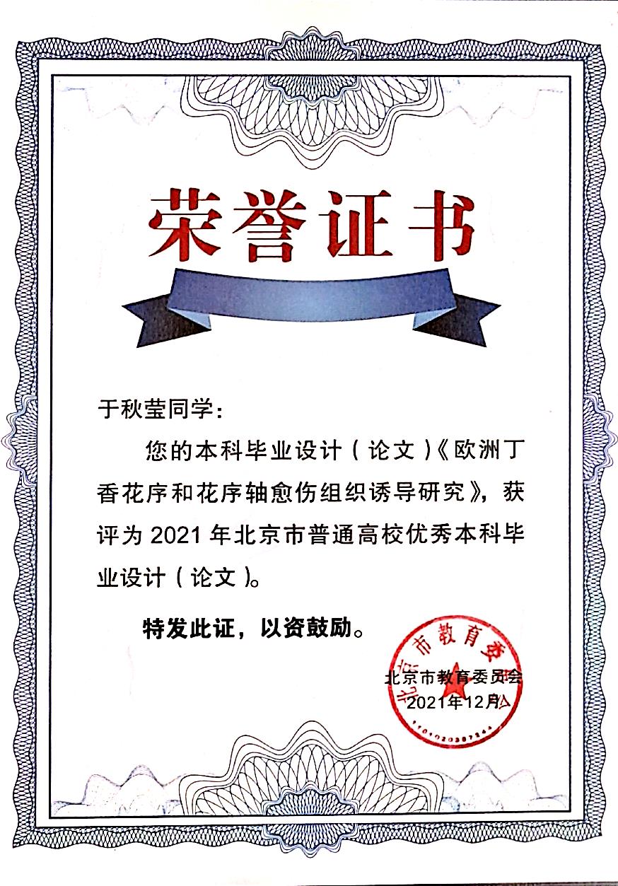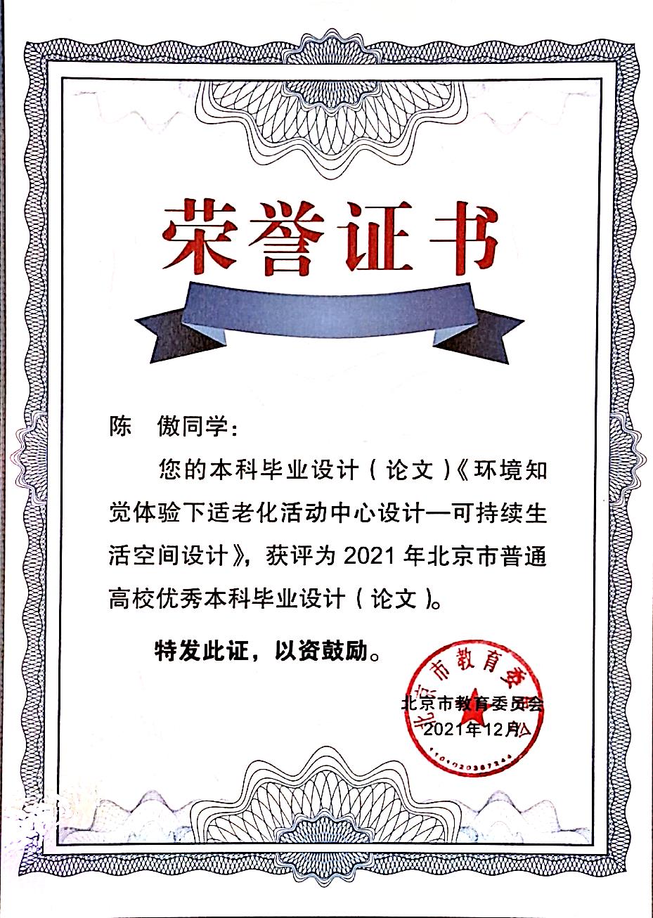 祝贺朱梦笛、陈傲、于秋莹三位学生的本科毕业设计(论文)获评为2021年北京市普通高校优秀本科毕业设计(论文)