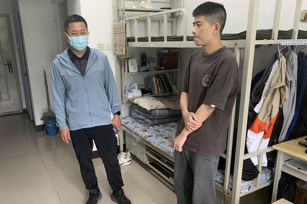 5月1日,学院党总支副书记、副院长李国政和辅导员杨刚走进学生宿舍,一对一地了解在校学生的学习和生活情况,提醒学生认真落实校园疫情防控要求,严格执行宿舍用电安全和每周一次大扫除的规定,共同营造良好舒适的居住环境。