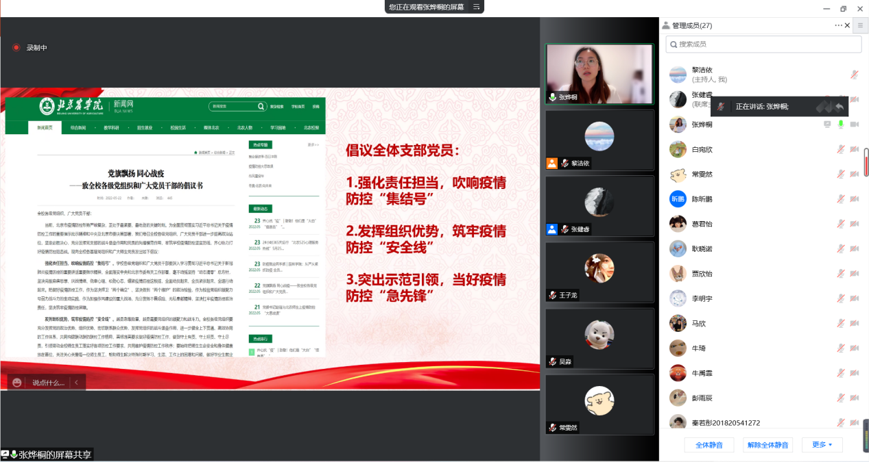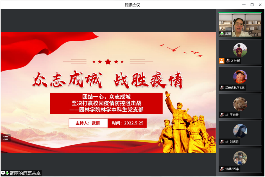 本科生与研究生党支部于5月23日至29日,召开“团结一心,众志成城,坚决打赢校园疫情防控阻击战”线上主题党日活动,各党支部书记主持会议。