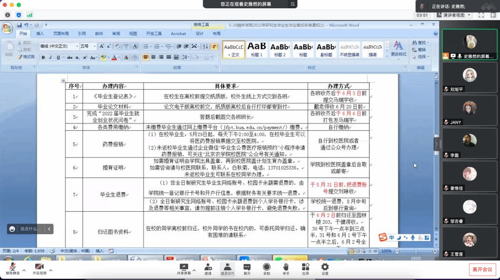 会上,首先由辅导员史雅然老师为全体研究生进行毕业相关工作内容和要求的安排部署,就同学们关心的毕业证、学位证等证书发放,行李物品整理,退费办理等事项进行了解释说明。
