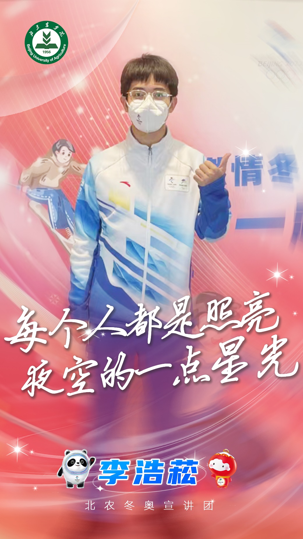 冬奥志愿服务让他深深地认识到每个人都是照亮夜空的一点星光。第一次穿不上防护服的窘迫、长时间上岗导致的头疼,这些曾经都让他感到任务的艰巨;可是同行伙伴的帮助、所有人的团结合作,让他在前行的道路中越走越亮。冬奥之旅,让他感谢每一个人的帮助;北京冬奥会和冬残奥会的成功举办,让他坚信任何工作的成功都离不开所有人的努力和奉献。他非常荣幸能够参与这样的世界盛典,为自己的祖国感到自豪和骄傲!