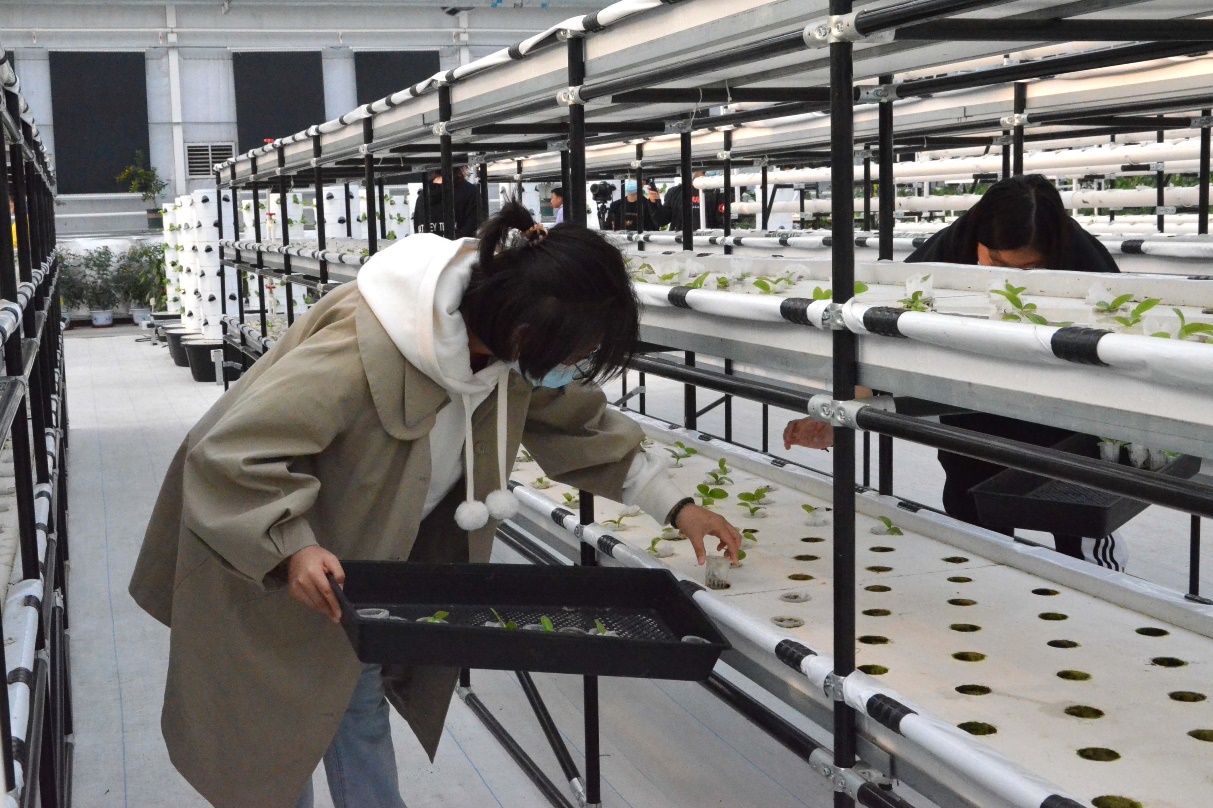 活动前邀请专业老师简单地介绍了移苗任务和技术要领,宣讲了我校无土栽培技术进展,进行了劳动任务分工,为学生答疑解惑。劳动现场热火朝天,同学们有的用水清洗盛放幼苗的器具,有的将苗子移栽到盆中,有的将苗子摆放到水培架上。同学们全身心地投入到劳动中,体验着新农业、新技术。“将一颗颗的小苗子从穴盘中取出来,放在准备好的营养槽内,让它们在水培的环境中生长,真是一件有意思的事情。”新生董锦艺说道。