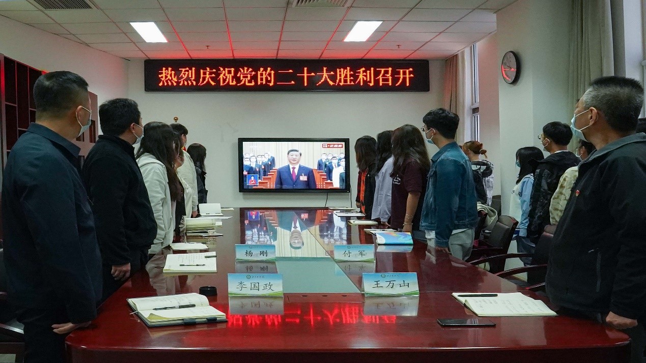 学院党总支在学院会议室举行集体学习会,组织学院班子成员、师生党员代表集中观看学习党的二十大开幕会直播。随着大会开幕,收看直播的同志们全体起立,高唱国歌。与会同志全程认真聆听习近平总书记代表第十九届中央委员会作的主题为“高举中国特色社会主义伟大旗帜,全面贯彻新时代中国特色社会主义思想,弘扬伟大建党精神,自信自强、守正创新,踔厉奋发、勇毅前行,为全面建设社会主义现代化国家、全面推进中华民族伟大复兴而团结奋斗”的大会报告,深入学习领会报告精神。开幕会历时近2个小时,习近平总书记的报告激动人心、催人奋进。当习近平总书记报告结束时,同志们也随着现场代表们一起长时间热烈鼓掌,表达对这次团结、胜利、奋进的空前盛会的祝贺,表达对总书记的坚决拥护和衷心爱戴。