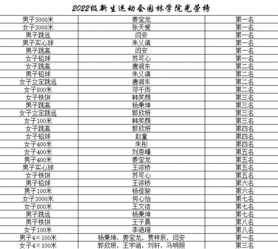 2022级新生斗志昂扬、追求卓越,取得了男女团体总分第一名、女子团体总分第一名、男子团体总分第二名的佳绩。