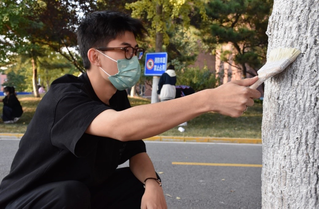 在活动开始前,林学专业的班长带领同学们利用一问一答的形式重温了课上老师讲解的树木防护知识。刷漆是北方树木冬季养护管理的一项重要内容,由于北方地区冬季昼夜温差大,树干容易冻裂,所以入冬前会为树干刷上保暖的石灰乳,可减轻阳光日灼,减少水分蒸发。同时还能驱除和杀死躲藏在树干表皮及缝隙里的病菌虫卵,防止病虫侵袭树体,促进树木健康生长。