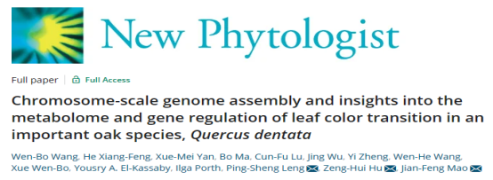 近日,TOP期刊New Phytologist(影响因子10.32)在线发表了题为“Chromosome-scale genome assembly and insights into the metabolome and gene regulation of leaf color transition in an important oak species, Quercus dentata”的研究论文,解析重要栎属植物-槲树染色体水平基因组并揭示其秋季叶色转变的调控机制。