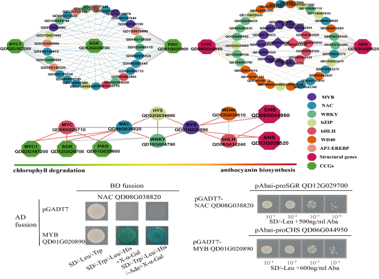 图2.槲树秋色叶转变过程中叶绿素降解和花青素合成的分子调控网络