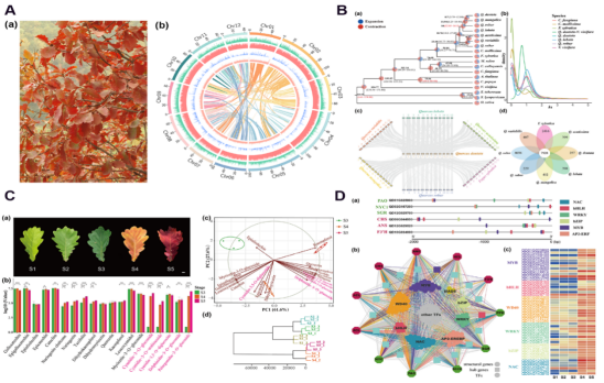 图1. A槲树基因组特征;B系统发育、基因家族和共线性分析;C叶色转变过程中类黄酮含量的变化;D叶色转变过程中相关转录因子表达量分析