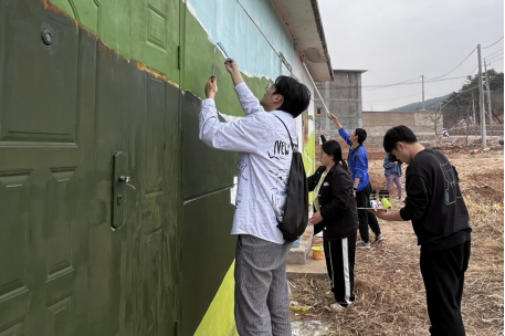 曾经“灰头土脸”的水泥墙,旧貌换新颜,一幅幅彩色墙绘,让原本冷冰冰的灰白色墙面瞬间有了温度。同学们用形象生动的画面,让乡村文化墙成为一道靓丽的风景线,获得了当地党支部和村民的一致好评。