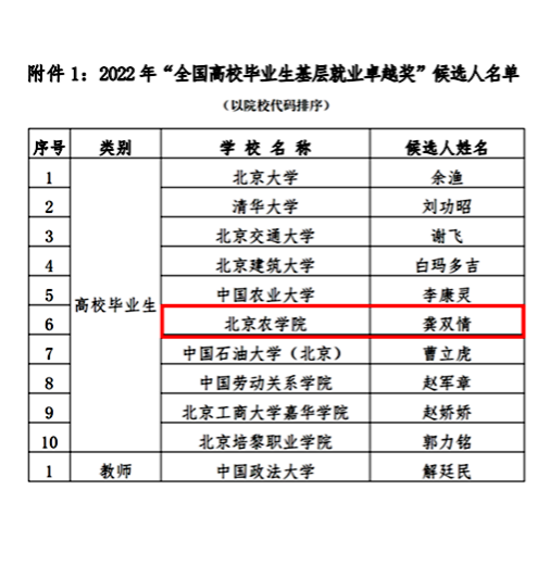 据悉,“高校毕业生基层就业卓越奖”是为奖励赴基层就业并做出突出业绩的普通高校毕业生,此次评选共推荐10人为2022 年“全国高校毕业生基层就业卓越奖”候选人上报教育部。