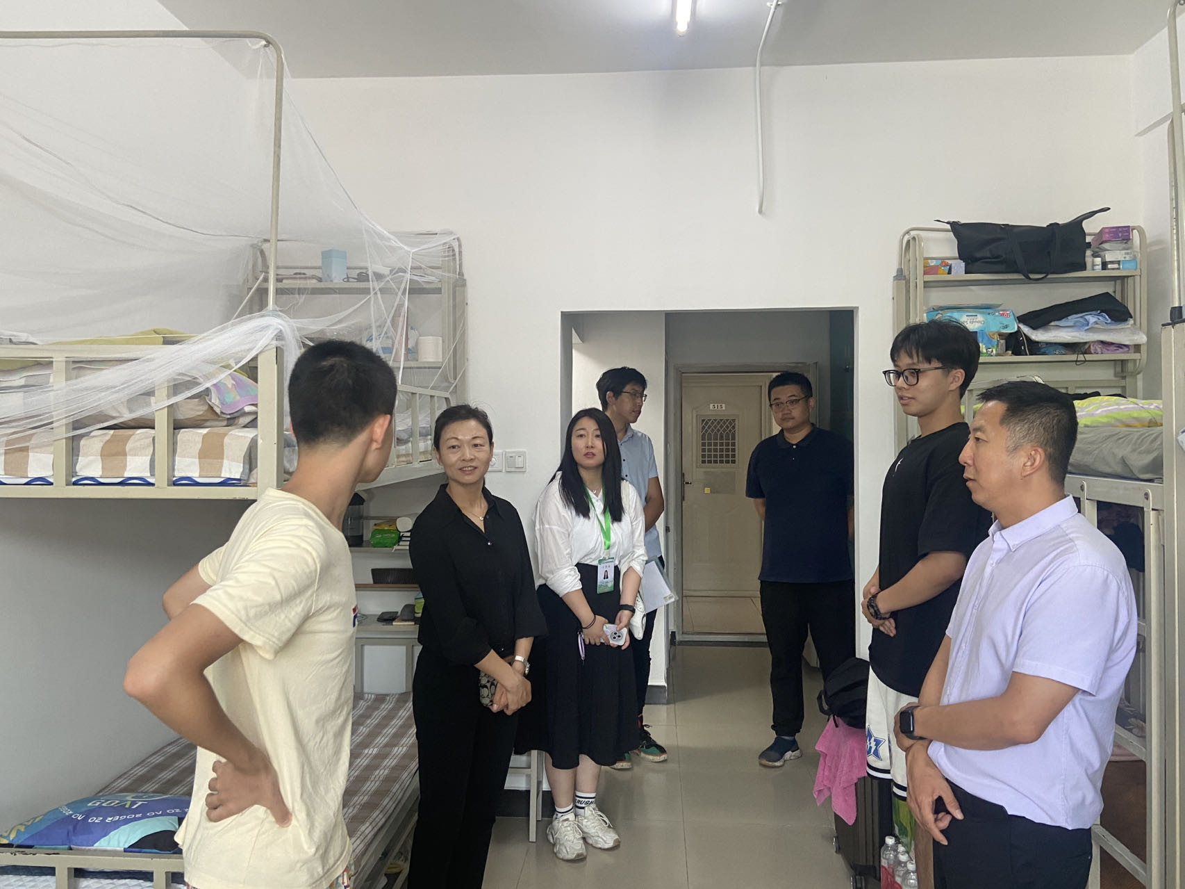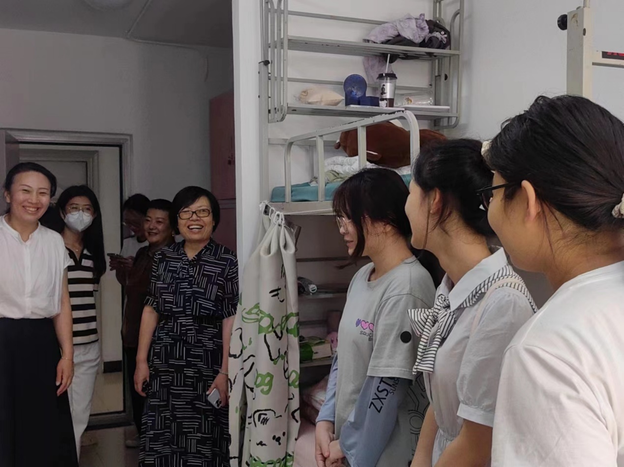 党委书记李金苹,副书记李国政,副院长付军、孙薇薇,全体辅导员和新生班主任来到7号和9号学生公寓,走访新生寝室,与新生亲切交谈,关心问候新生报到后的感受,确保新生们住的放心、住的舒心。并提醒新生时刻注意人身财产安全,勉励同学们尽快适应集体新生活,携手共进,以饱满的热情投入到大学的学习生活中去。