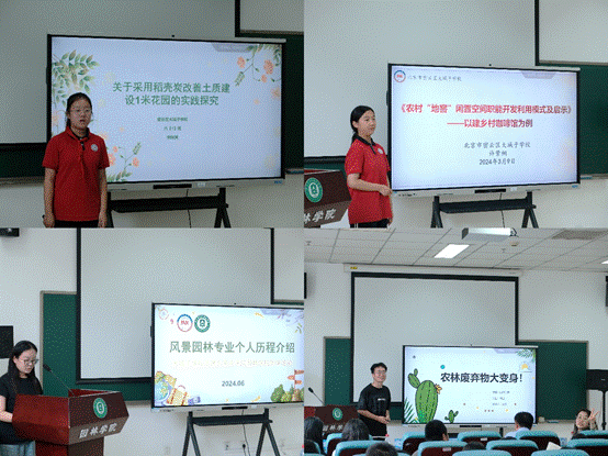 研究生王晓蔚为同学们介绍了风景园林专业学习、工作日常,并展示了个人设计的景观作品、沙盘、水彩和素描作品等;贾文对农林废弃物的循环利用方式、生产应用方向以及重复利用的意义和重要性等方面,生动形象的为同学们科普了农林废弃物如何进行“变身”。