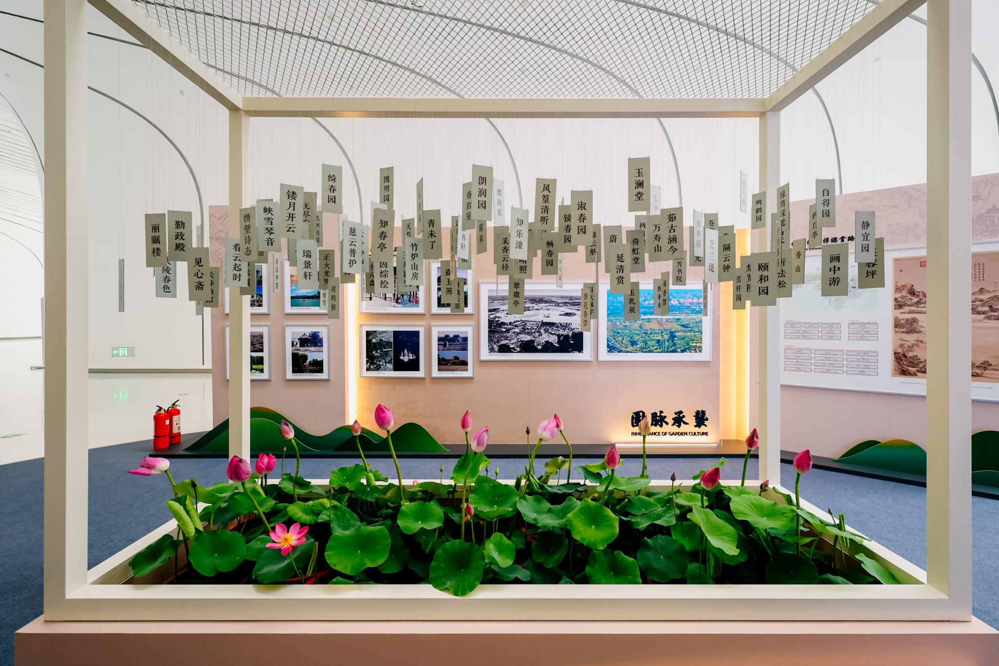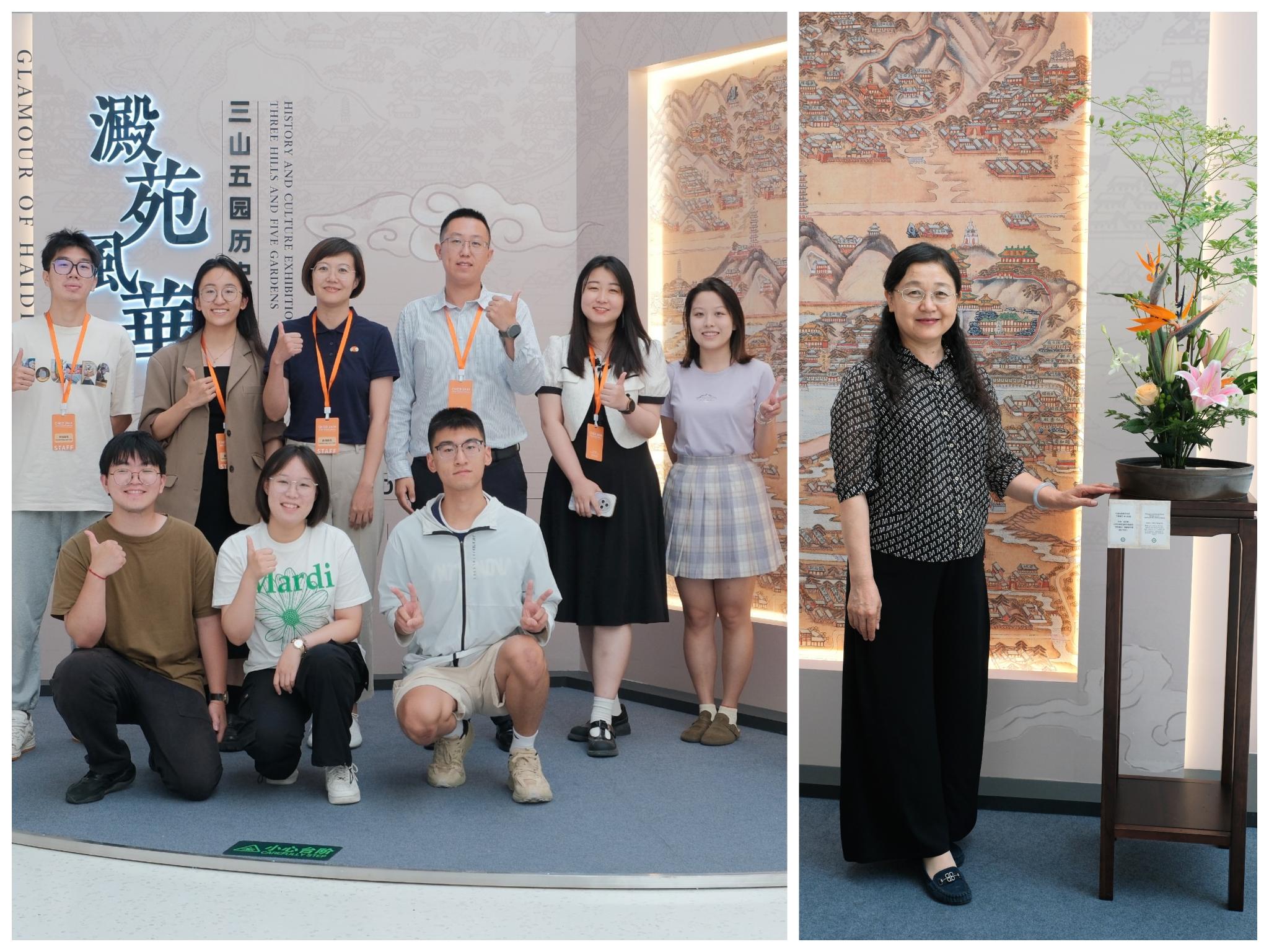 三山五园工作室的最新作品,师生团队共策划了“园景大成”“园居风尚”和“园脉承袭”三个主题。展览主视觉像一册翻开的古书,描绘三山五园盛期全景的古画嵌入其中。在150平米的开放式展区内,共有包括插花艺术作品、数字复原成果、复刻清代御玺与舆图、专题内容图版和古今影像在内的30余件展品。借助这些丰富内容,与会嘉宾可直观地了解到三山五园具有国际影响的园林艺术成就、在清代“居园理政”的独特历史功能,以及当代国家对其保护与传承的历程,特别是近年来海淀区创建“国家文物保护利用示范区”取得的成果。