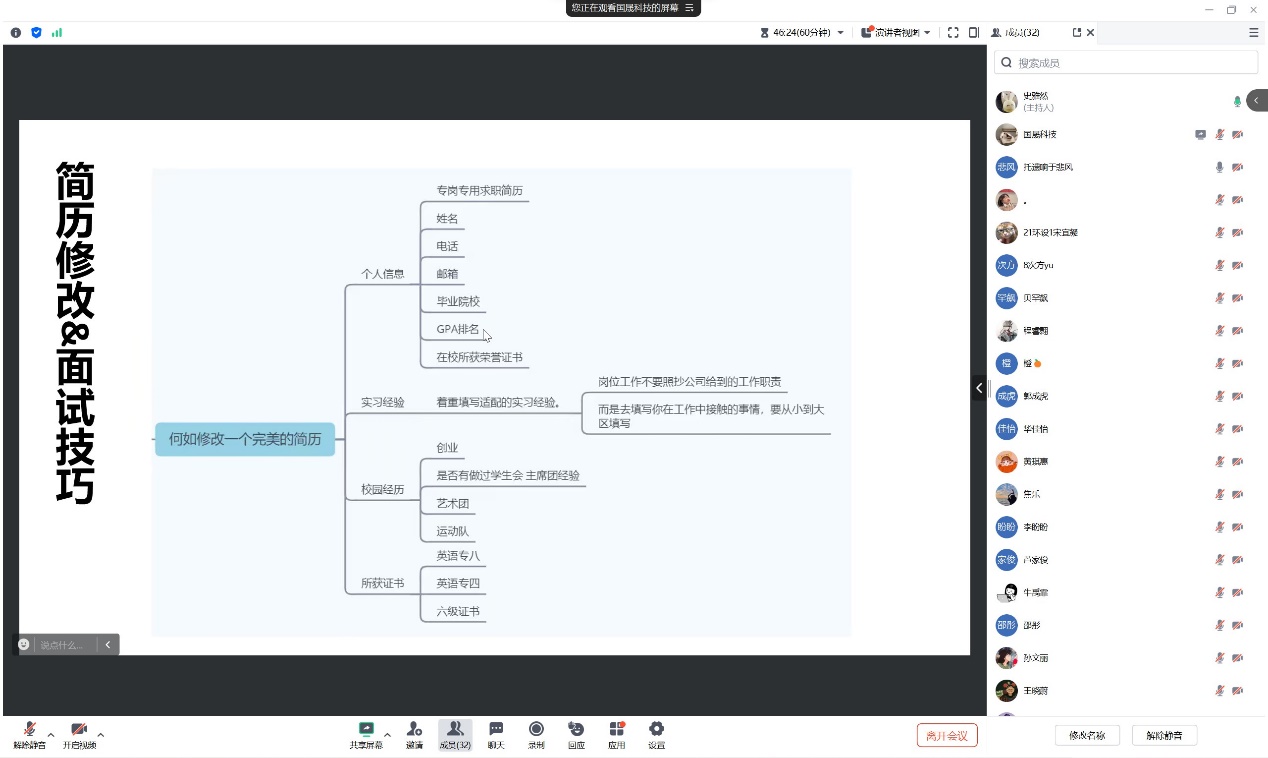 朱智旭为大家介绍了目前园林行业的发展趋势和前景方向。以行业内常用的MBTI的应用为引入,从人力资源的专业角度帮大家分析了不同性格求职者的个人成长路线和方向。重点对于简历内容的撰写和面试技巧等进行了培训:详细介绍了准备一份专岗专用的简历的重要性,招聘单位从简历中关注的重点内容有哪些,如何在简历中突出个人的优势,面试前需要做哪些准备,面试中的注意事项等。同时,对同学们提出的问题进行了一一详细解答,并为同学们进行现场修改简历。