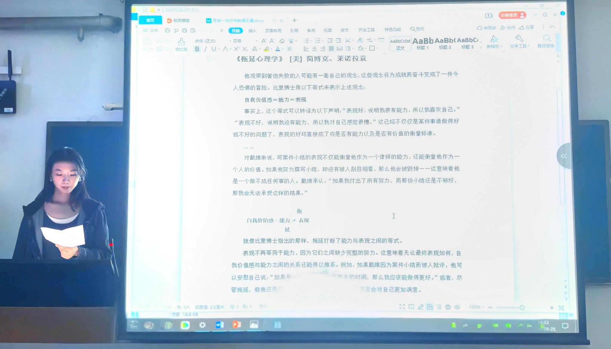 “自我价值感=能力=表现。表现不再等同于能力,因为它们之间缺少完整的努力。这意味着无论最终表现如何,自我价值感与能力之间的关系还能得以维系。”王澜同学为我们朗诵《拖延心理学》,引领我们一同认识拖延、克服拖延,开启高效自律的人生之旅。