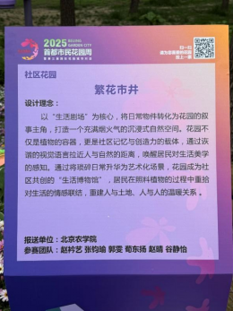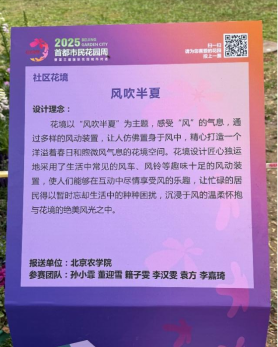 由北京农学院马晓燕、冯丽教师团队带领学生们完成的“风吹半夏”“繁花市井”两组作品以独特的设计理念在众多设计作品中脱颖而出,顺利入选社区花园(花镜)展赛并完成搭建。作品紧扣社区生活与自然主题,极具感染力,赢得市民的广泛喜爱与高度赞扬。