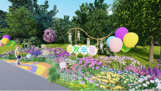 “风吹半夏”花境匠心独运地融入了风车、风铃等充满生活气息的风动装置,这些平日里常见的物件,在园艺师的巧思下,摇身一变成为营造氛围的点睛之笔。