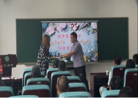 在自我介绍环节,新生们纷纷讲起自己的爱好与兴趣,加强了彼此之间的了解。十分巧合,恰逢有一名新生过生日。学院领导、老师、学长学姐齐唱生日歌为过生日的新生送上了生日祝福和蛋糕,为她过了一个难忘而又有意义的“十八岁生日”。