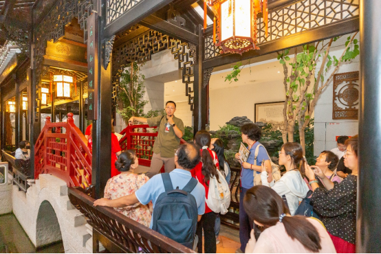活动尾声,参与者们分享了他们的感悟。最后,由朱强老师邀请参与活动的游客们进行了一下夜游园博馆活动体验的总结。其中资深园林爱好者高老师在随朱老师游览后表示,此次行程收获丰富。朱老师的讲解让曾多次前来的我终于理解了这些园林的深意,如小桥的视觉延伸作用,以及“灰塑”的材质真相等。我们还享受贵宾待遇,得以细赏厅堂内的匾额、楹联和木雕。感谢朱老师的组织。