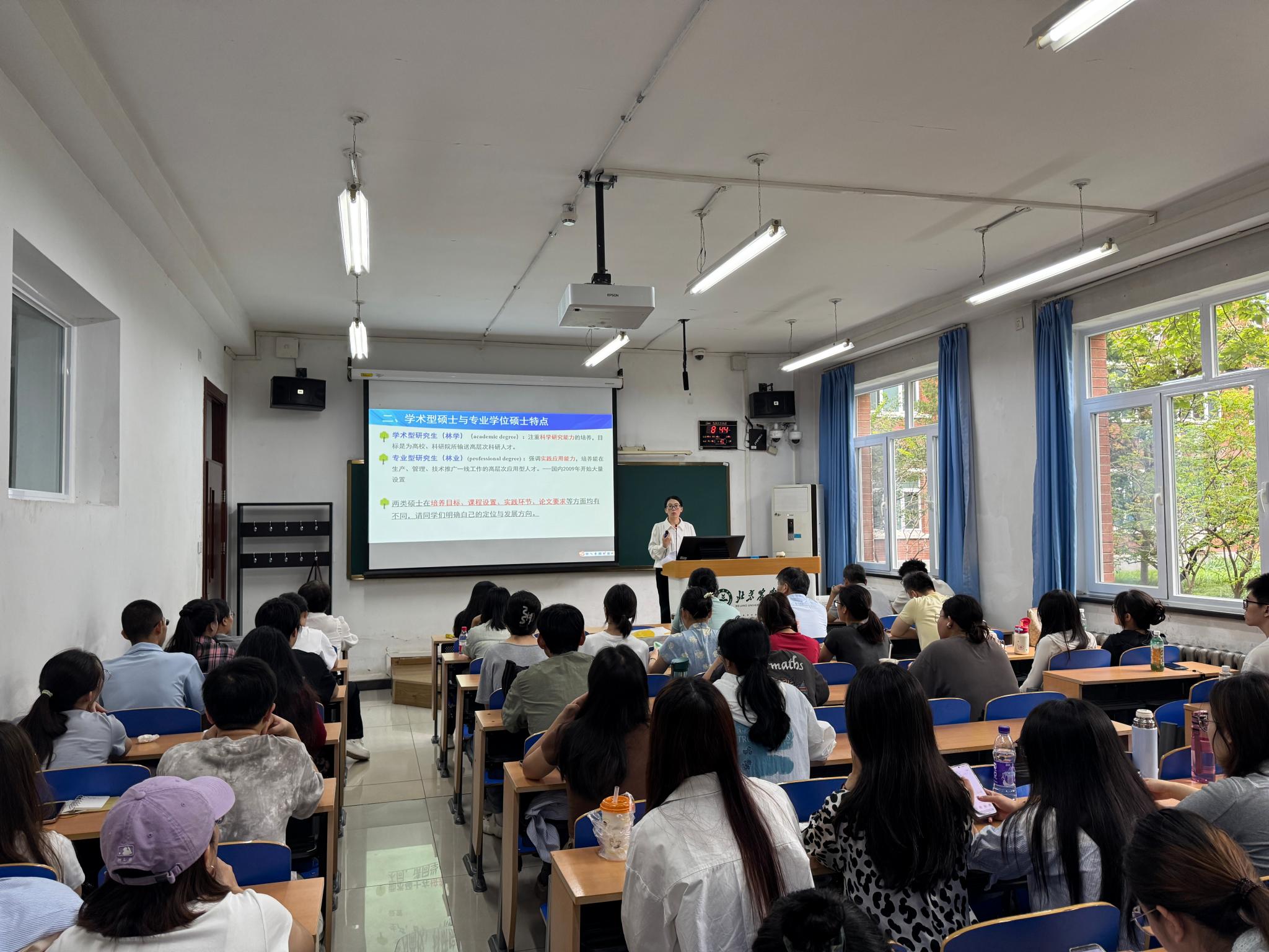 会上老师为同学们介绍了学院的发展历程、师资力量、科研成果以及各专业的特色与优势,让新生们对学院和自己所学专业和学业要求有了进一步的了解和认识。针对风景园林专业,付军讲解了目前我国风景园林学科的发展现状及未来趋势,解读了新一版研究生培养方案核心内容,并强调实践与理论结合的重要性,鼓励学生积极参与实际项目,提升综合能力与创新思维。对于林学、林业专业,吴静围绕林木遗传育种、森林生态、森林培育、森林保护等方向,阐述了行业的发展趋势与前沿技术,引导学生关注生态林业建设中的实际问题,培养解决复杂问题的能力。
