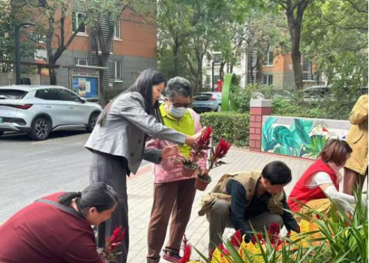 李金苹和王宇泓两位老师带领研究生与社区居民携手协作,用鲜花与汗水装点家园,共迎国庆到来。
