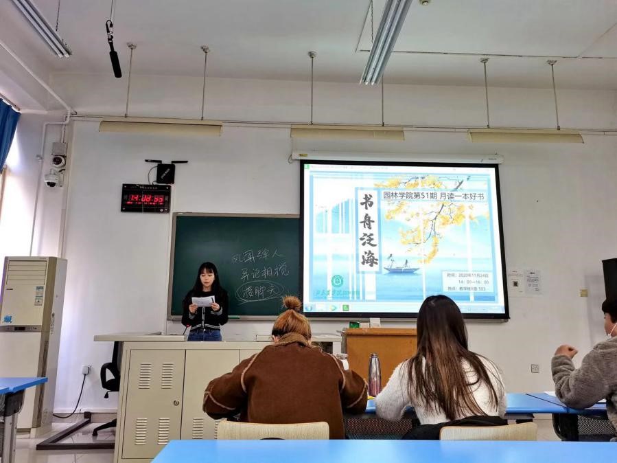 第一位进行分享的是林业专业研究生白云海同学,他为我们带来史铁生先生的《我与地坛》。《我与地坛》是史铁生先生所著的一篇长篇哲思抒情散文。文章充满哲思又极为人性化。白云海同学首先讲述了史铁生先生的生平和成就,让同学们了解这位伟大不屈于命运的作家;随后对这本书的主要内容进行了概述,最后白云海同学感慨到:“这次重读这本书,我不禁被他自强不息的精神和非比常人的毅力所感动,生命的意义就在于你能创造这过程的美好与精彩,生命的价值就在于能够镇静而激动地欣赏这过程的美丽与强壮。”