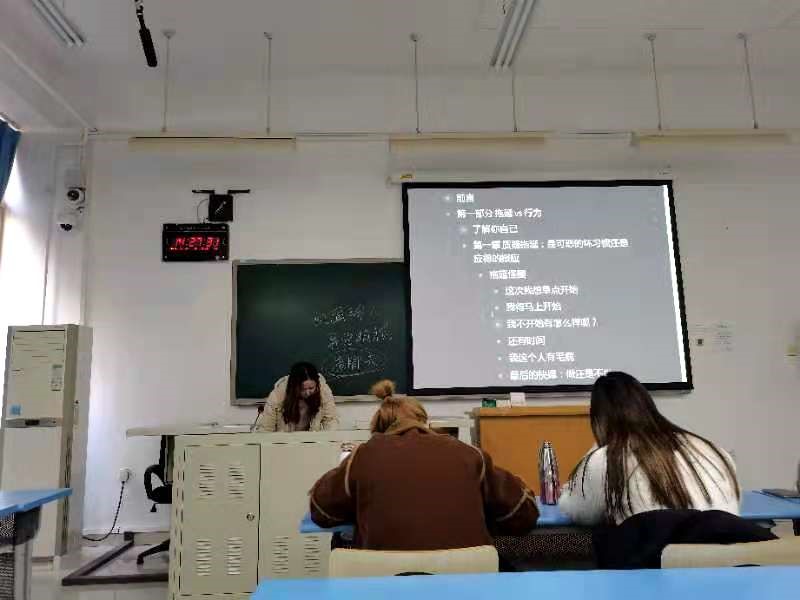王菲同学分享后,林学专业研究生贺紫巍同学基于对拖延的理解作了又一次仔细、详尽的探索。通过鉴别和检查那些我们将事情推掉的背后原因——对失败、成功、控制、疏远和依附的恐惧,加上我们的时间概念问题和大脑的神经学因素——为我们学会怎样理解拖延的冲动以及怎样以全新方式采取行动做了一件非常扎实的基础工作。