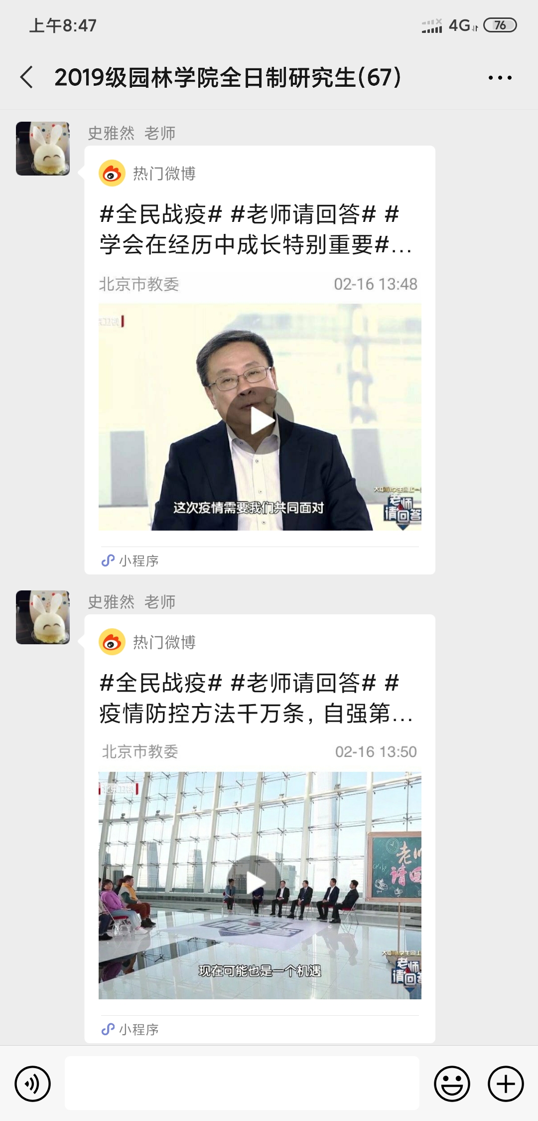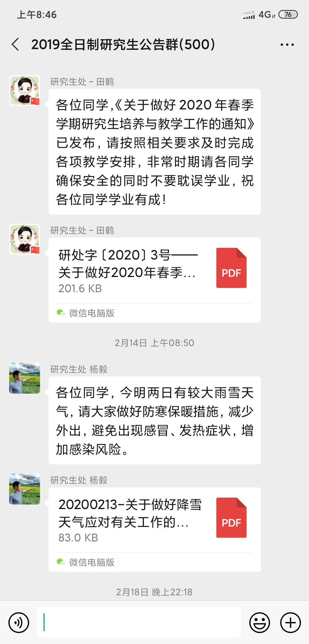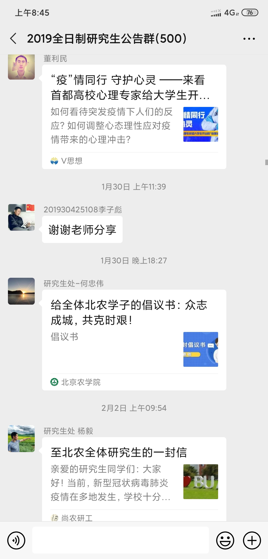 疫情打乱了我们的春节,打乱了我们正常的生活,作为北农学子的我们,在疫情中仍要学习,努力提升自己,待祖国需要时,我们可以定力而上。就像这次疫情中冲在前面的我们可亲可敬的医护人员,我们感谢他们,更要好好学习,不负他们的奋战。学校老师给我们不断推送各种学习资料,既有专业的学习资料,也有着我们面对疫情如何看待的一些观念指引,使我们可以客观、科学的面对此次疫情。疫情影响了开学,学校又及时下发《关于做好2020年春季学期研究生培养与教学工作的通知》,确保同学们可以正常继续学业。